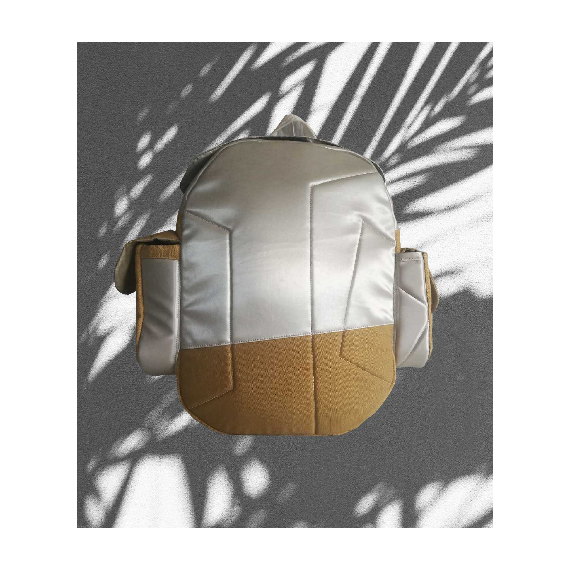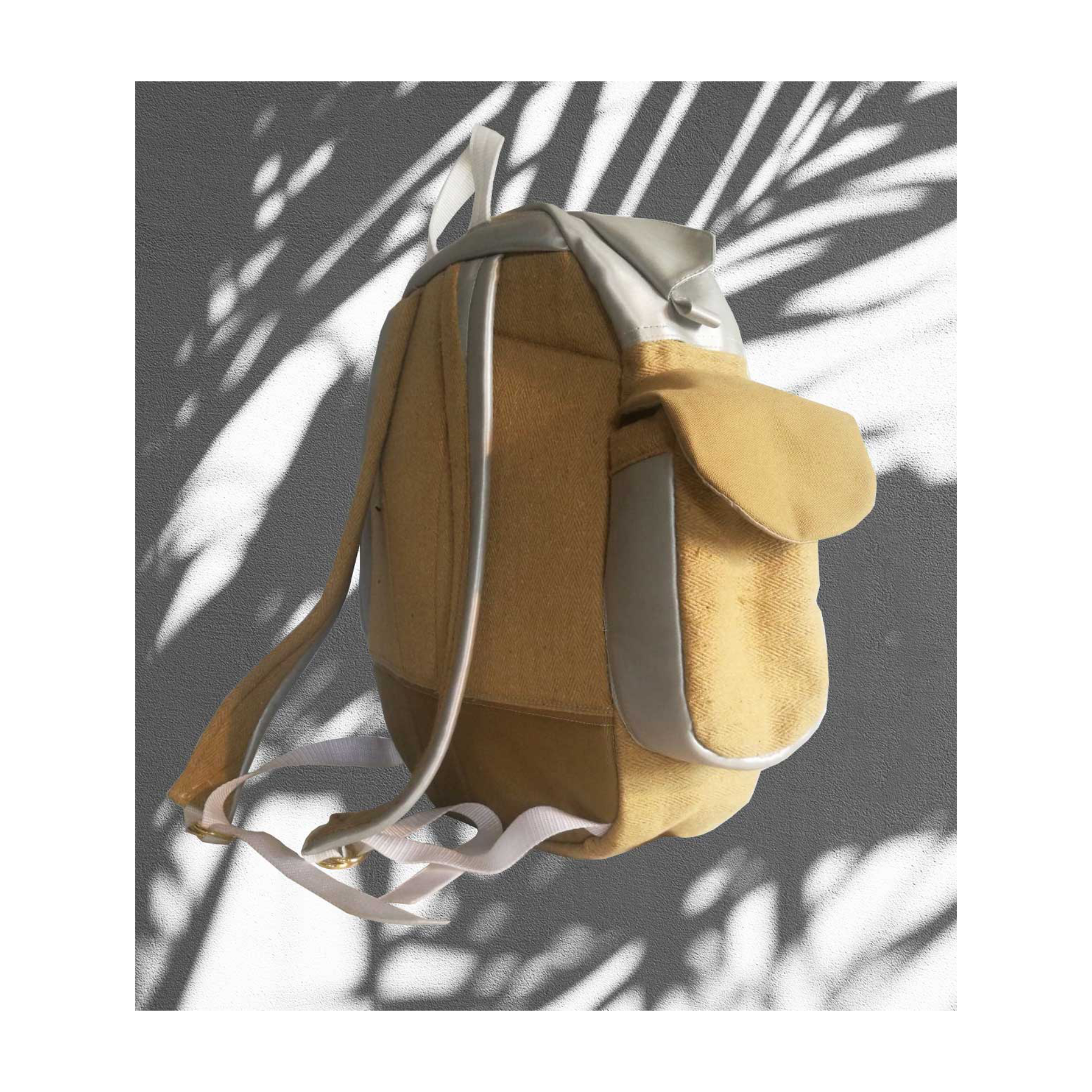Its form carries a speculative, almost architectural presence. Silver-grey PVC speaks to a futuristic language, while bright mustard-brown hemp introduces an earthy counterbalance. This contrast creates a dialogue between past and future, technology and nature.