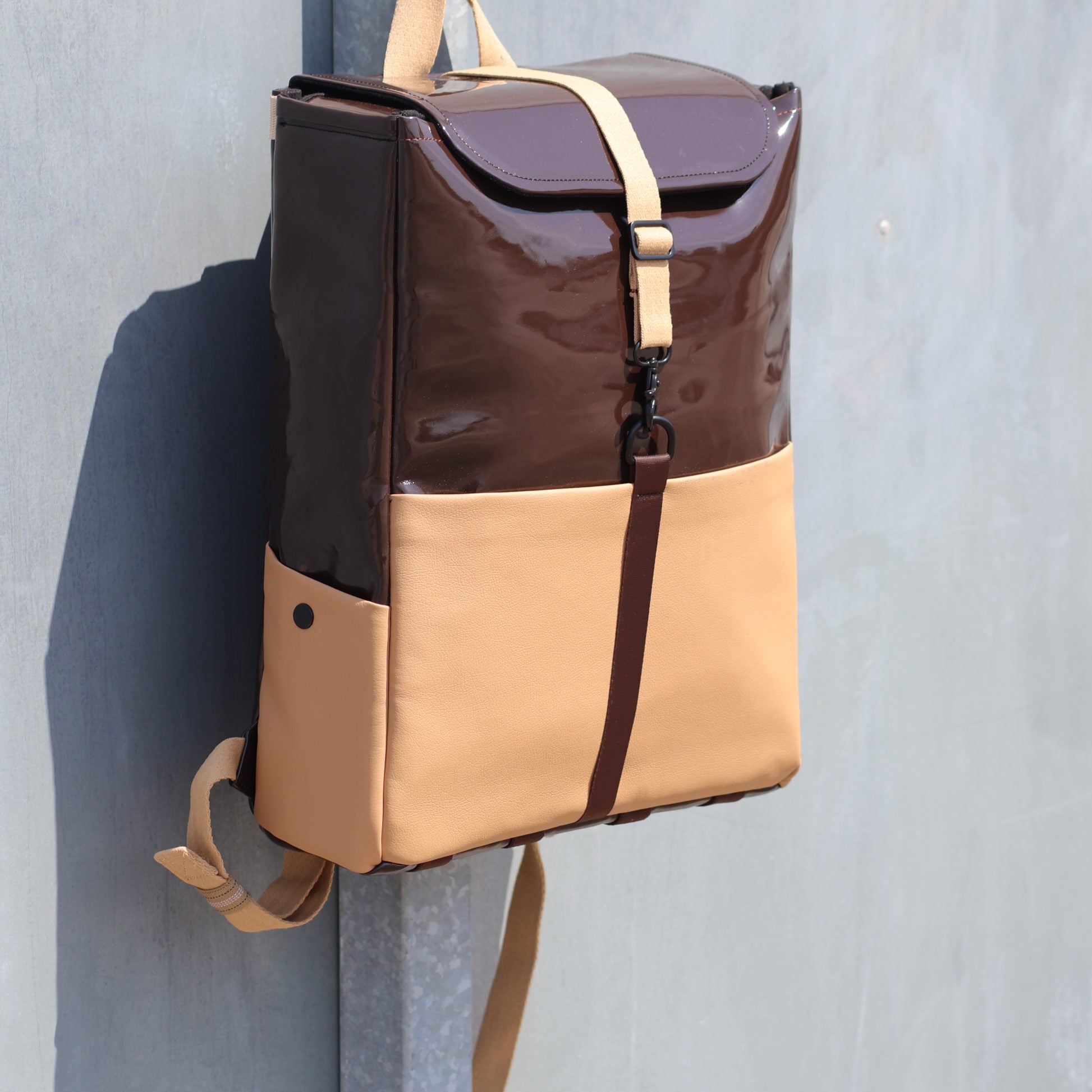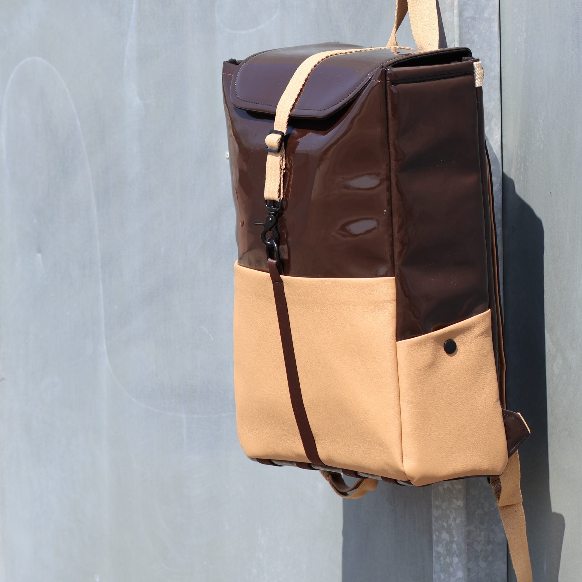 The Elysium H45 Backpack combines classic sophistication with practical design. Crafted from circular synthetic leather and brown PVC, its polished rectangular silhouette suits both professional and casual settings.
