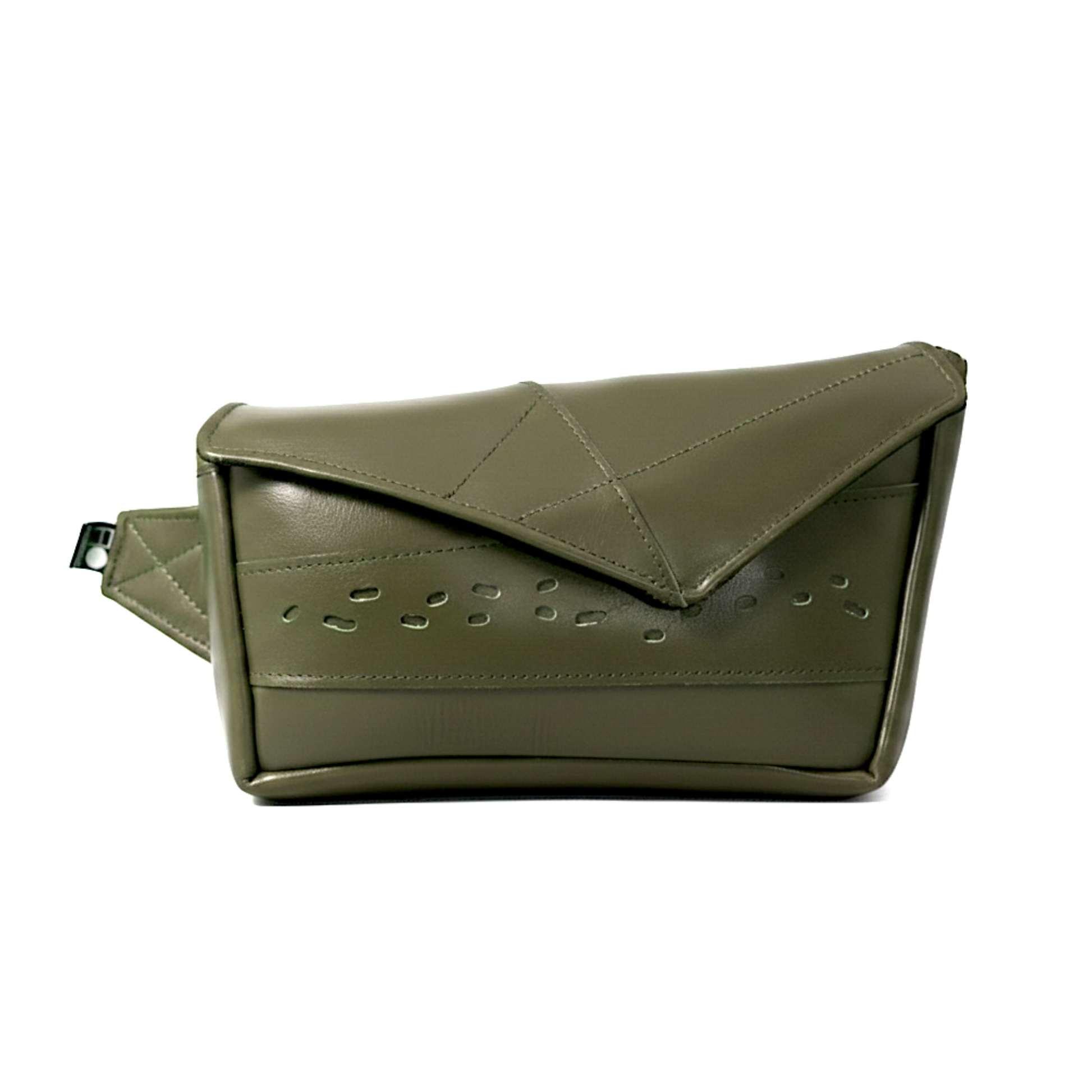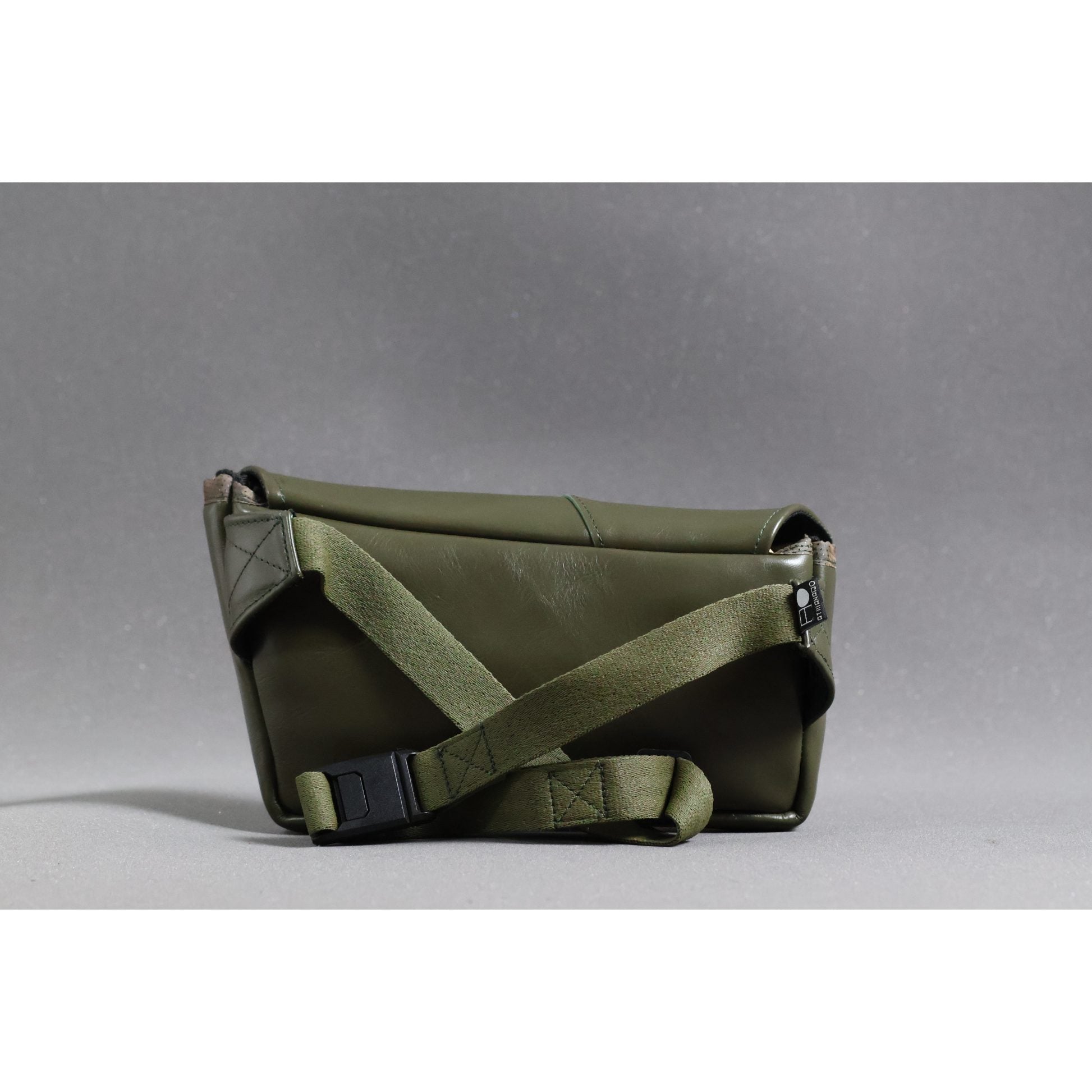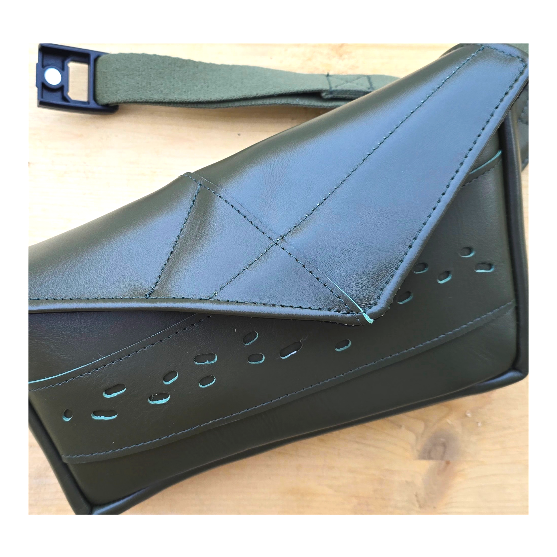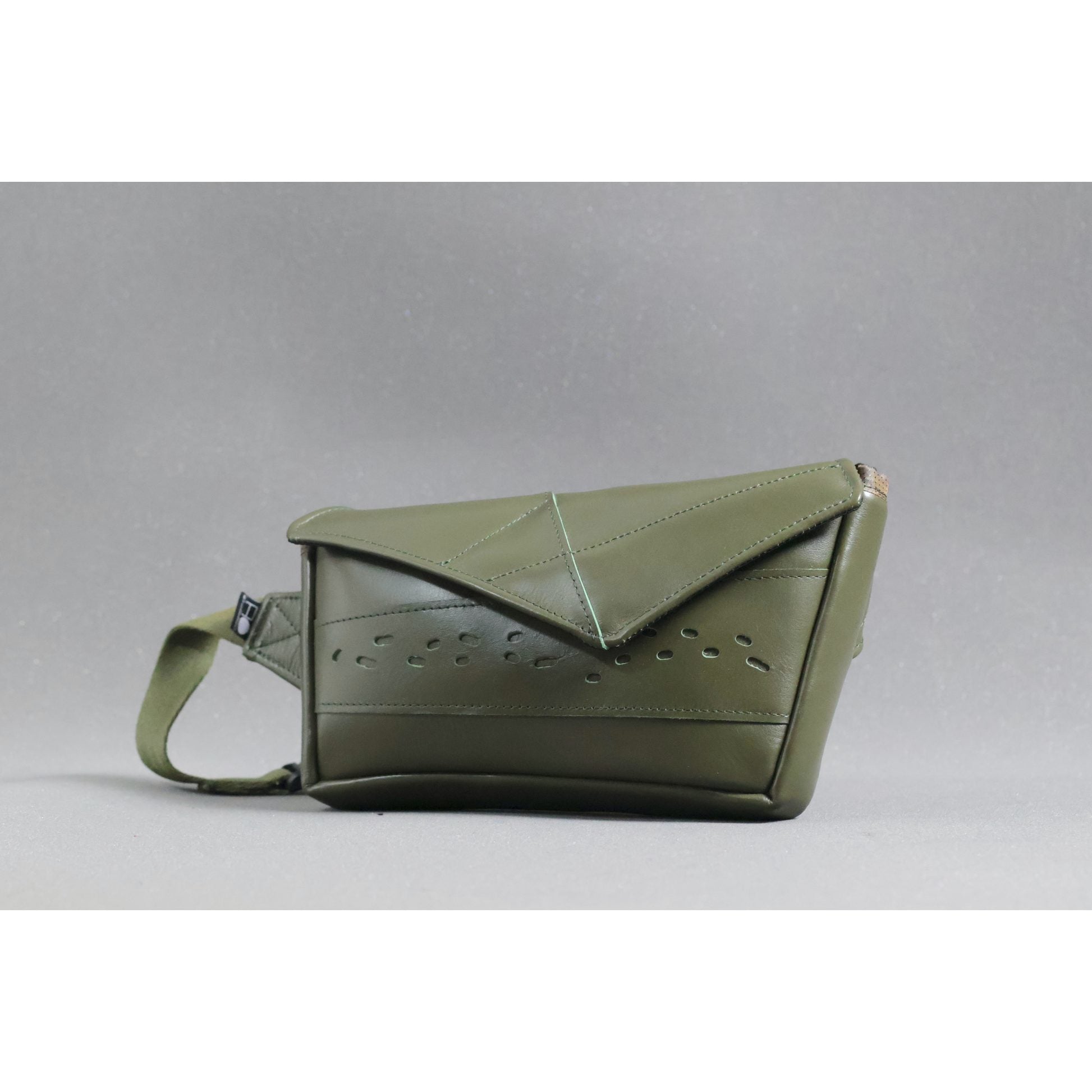 The Emris waist pouch is crafted from real leather, following the same structural language as its counterparts, yet distinguished by material and tone. The deep green leather brings a strong visual character, while visible handwork preserves the honesty of the making process — where precision meets rawness.